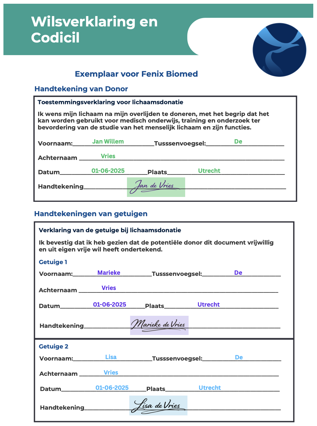 Handtekeningen van donor en getuigen voorbeeld