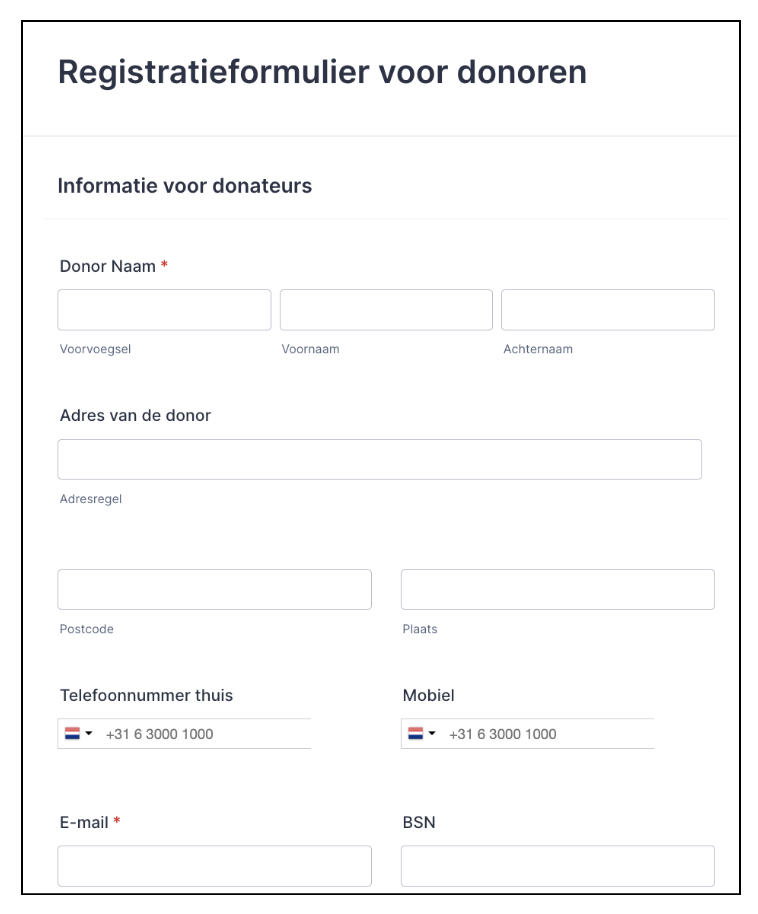 Onderaan deze pagina vindt u een voorbeeld van volledig ingevulde donorgegevens. Dit voorbeeld dient ter verduidelijking en laat zien hoe de verschillende velden correct kunnen worden ingevuld.