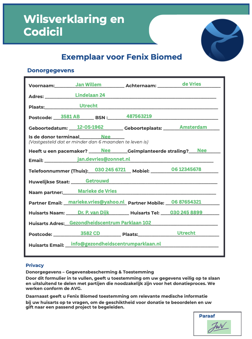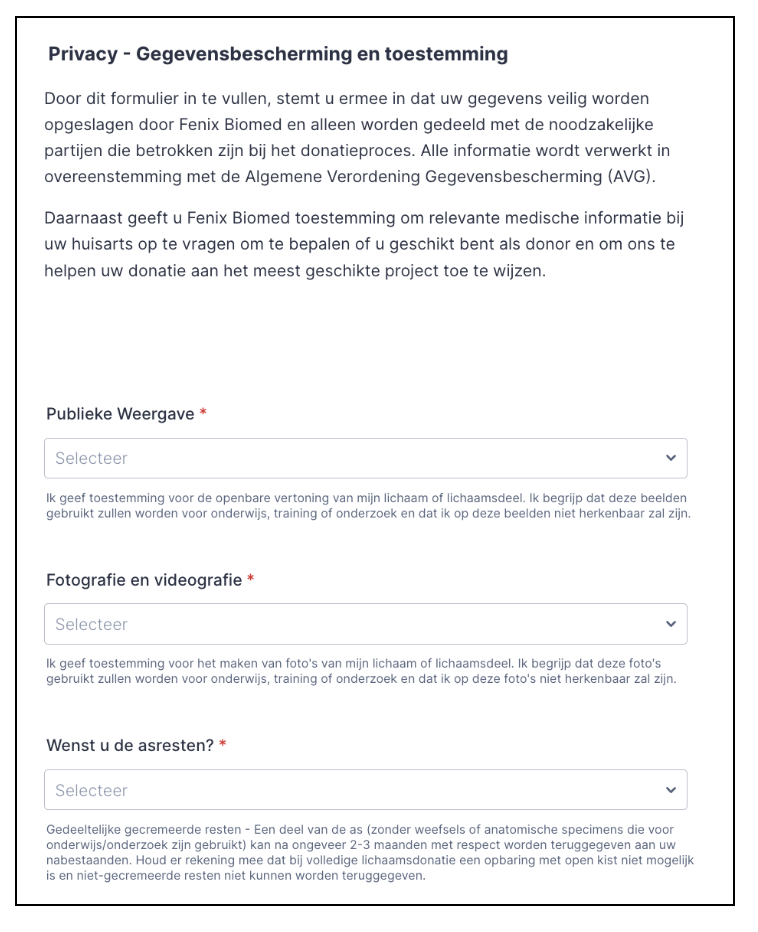 Wanneer u dit formulier invult, geeft u Fenix Biomed toestemming om uw gegevens te verwerken voor het lichaamsdonatieprogramma volgens de AVG. Indien nodig kan medische informatie bij uw huisarts worden opgevraagd.