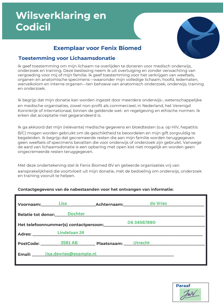 Onderaan deze pagina vindt u het voorbeeld van toestemming voor lichaamsdonatie, waarin wordt weergegeven hoe deze verklaring en de bijbehorende gegevens worden vastgelegd.