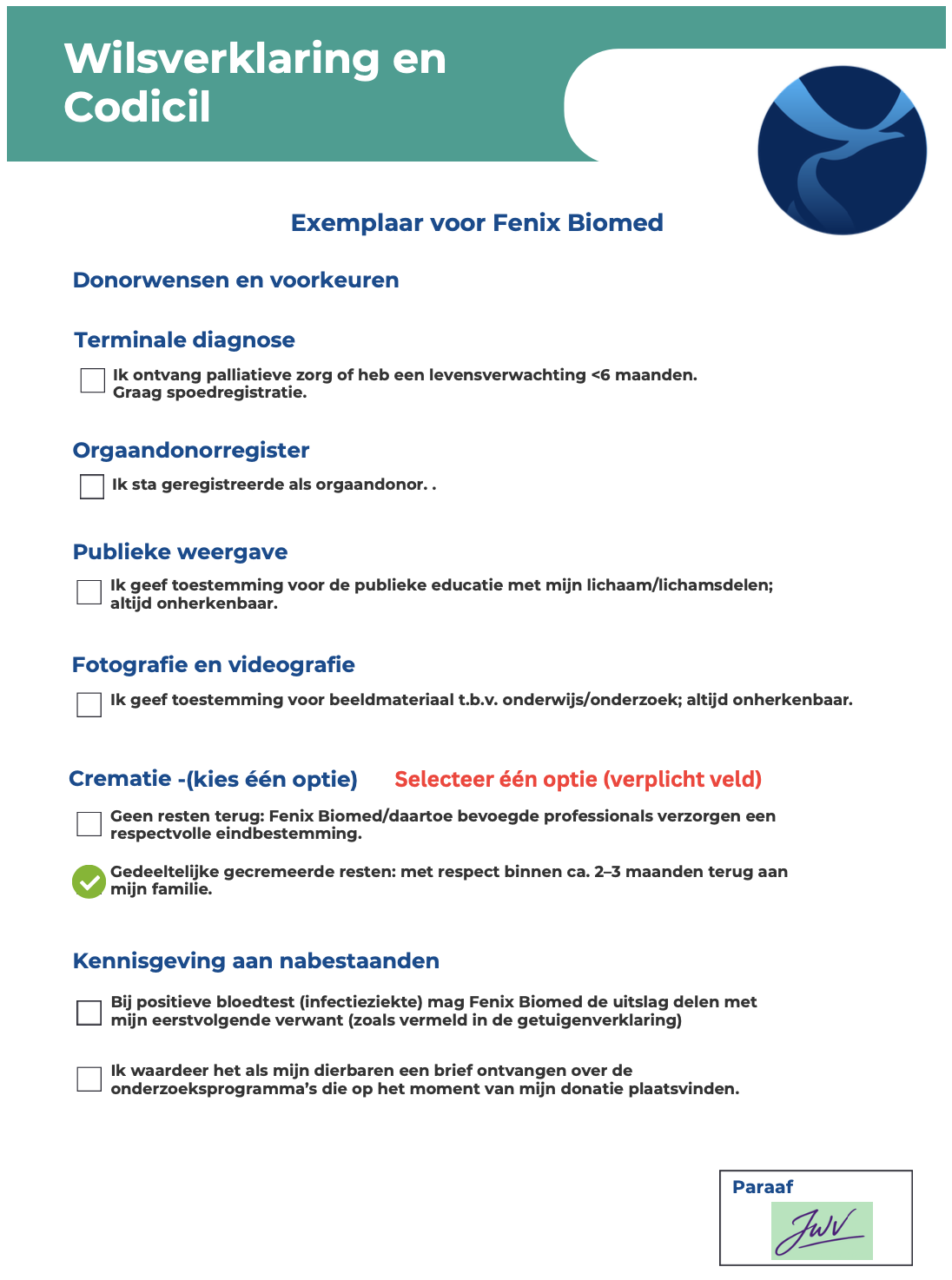 Met het online registratieformulier kunt u zich eenvoudig aanmelden voor lichaamsdonatie bij Fenix Biomed. Tijdens de registratie vragen wij u om verschillende gegevens in te vullen en uw voorkeuren vast te leggen met betrekking tot de donatie.