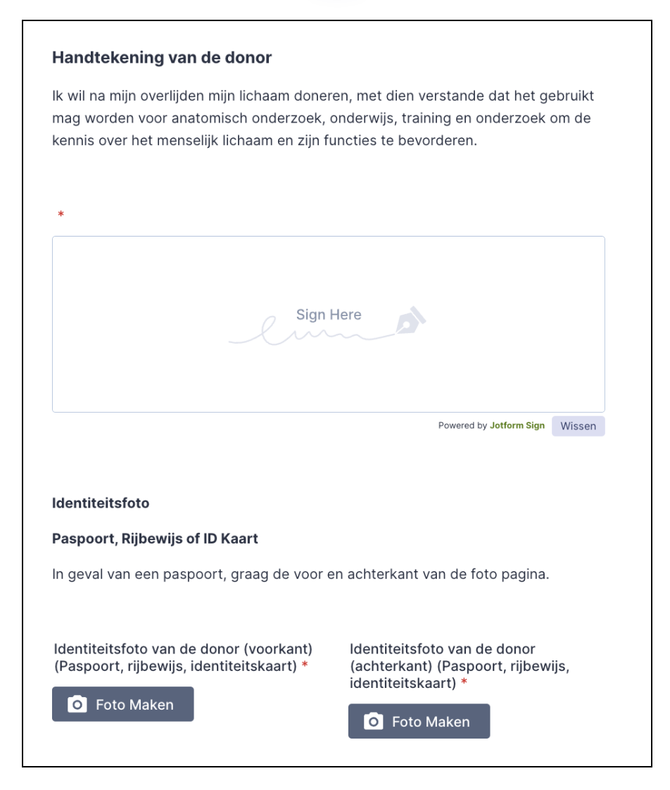 Hier ondertekenen u en een onafhankelijke getuige digitaal de toestemmingsverklaring. Daarnaast wordt van zowel de donor als de getuige een foto van een geldig identiteitsbewijs (voor- en achterkant) geüpload.
